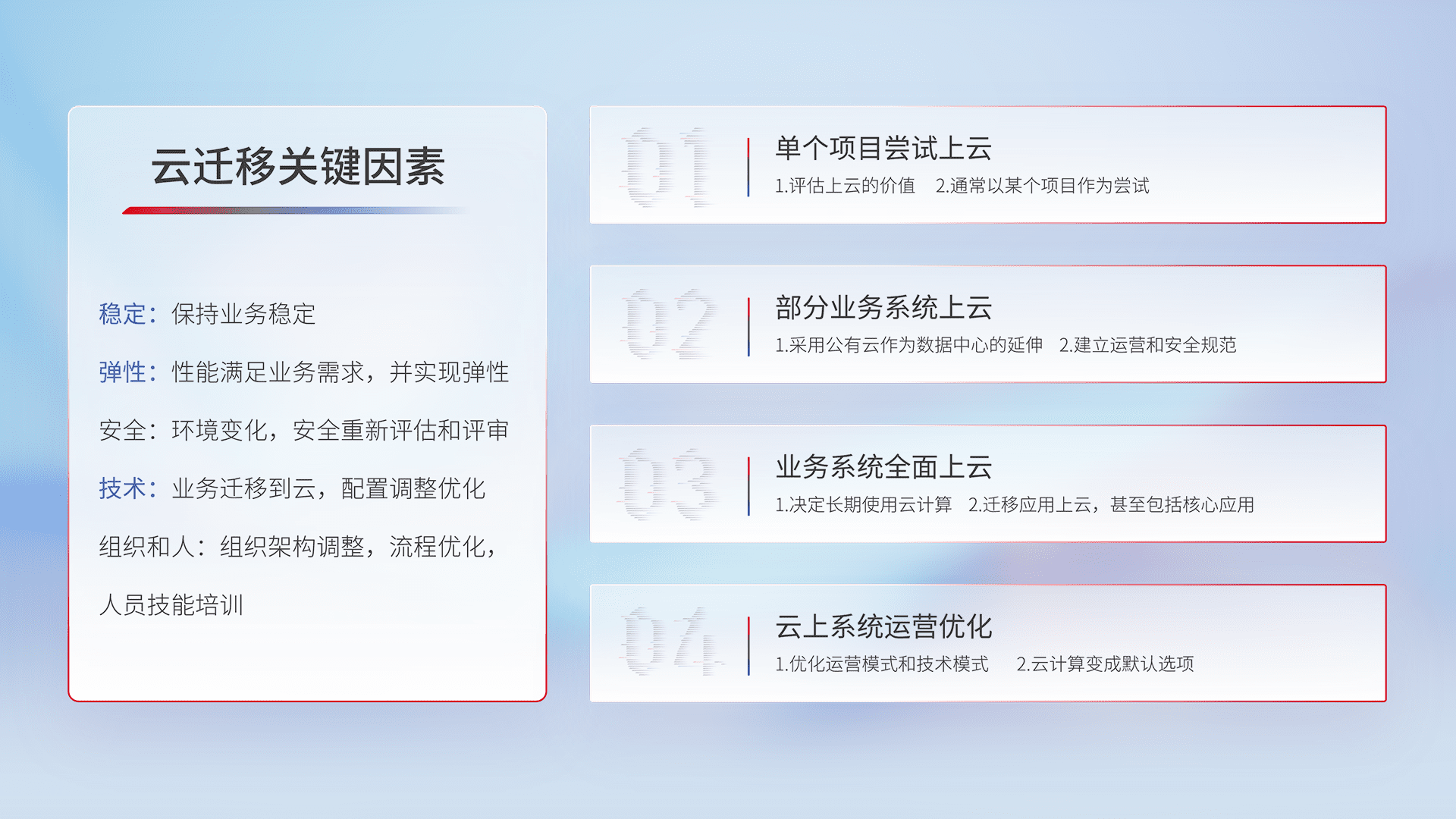 结合实际业务,,从规划设计、、、云平台选型、、云原生改造、、、、数据迁移、、、、集成交付,,,,迁移全过程为客户识别最佳上云路径,,,做好风险识别管理,,设计网络架构、、身份权限、、安全审计合规、、、操作审计、、日志审计、、监控告警策略、、、多站点容灾设计等,,,,对云上基础设施进行整体规划,,提升IT治理水平,,以满足弹性、、、高可用、、、、高性能的需求。。。